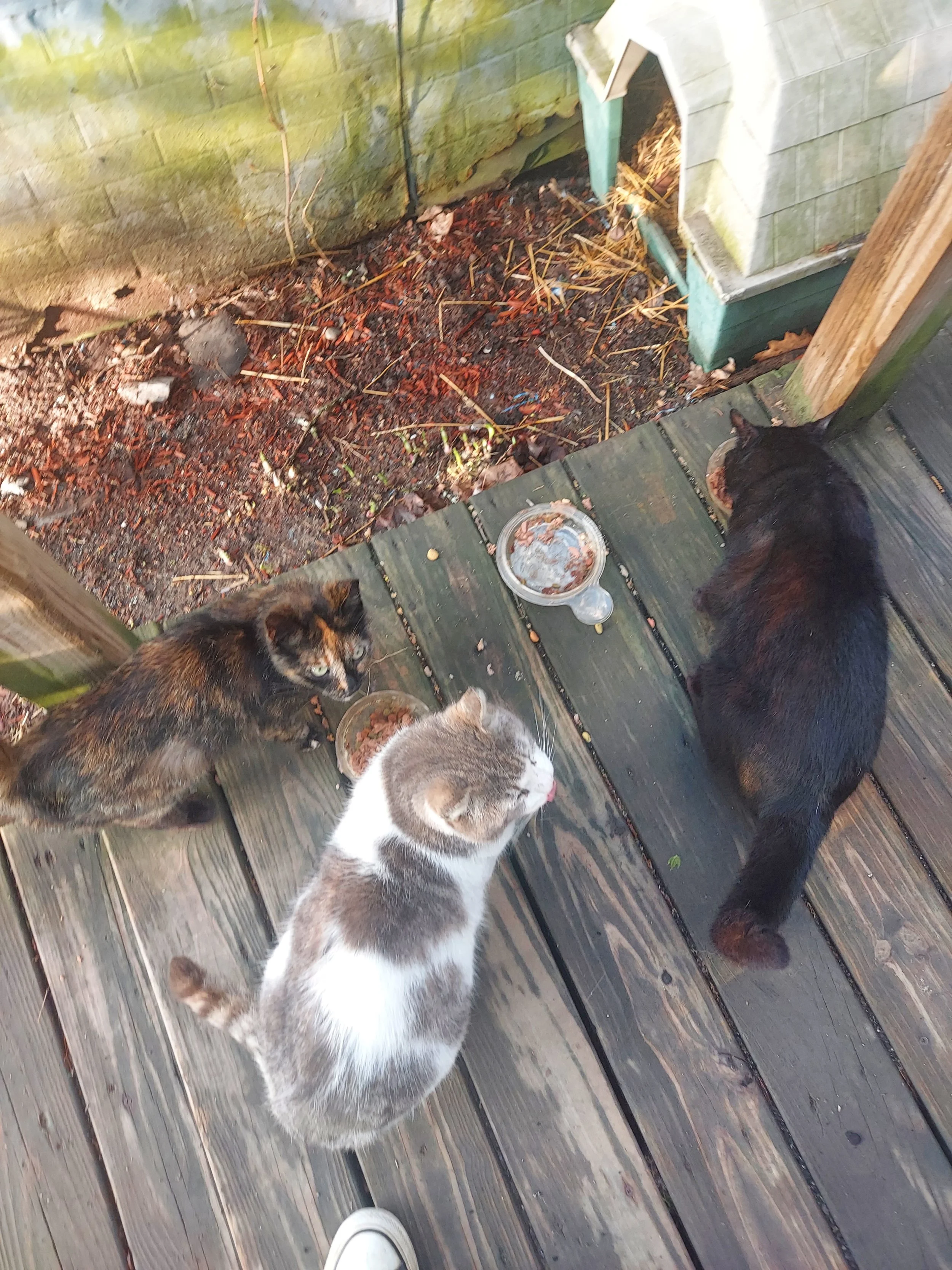 Schroedinger the cat is a semi-feral boy who decided that he is uninterested in items owned by humans with the exception of cat food. He is extremely affectionate with people, yet continues to reject outdoor shelter structures. He opts to live in a crawlspace where the dryer vents out, and as such our laundry schedule has recently been re-routed to meet his needs better in cold weather. Schroedinger has a tipped ear, signifying that our local animal rescue network has been in direct contact with him and has engaged with him in their feral neuter and release program, which could explain his rigid aversion to all things cat carrier. His needs are basic at this time, however as Schroedinger ages, his veterinary requirements will likely become more demanding and will require a plan to address them as he becomes more comfortable. He presents as healthy, with the exception of black spots that have begun to appear on his paw pads. This signifies a vitamin deficiency that suggests a diet consisting of mostly what he has been able to catch in the local wooded area where he was found.